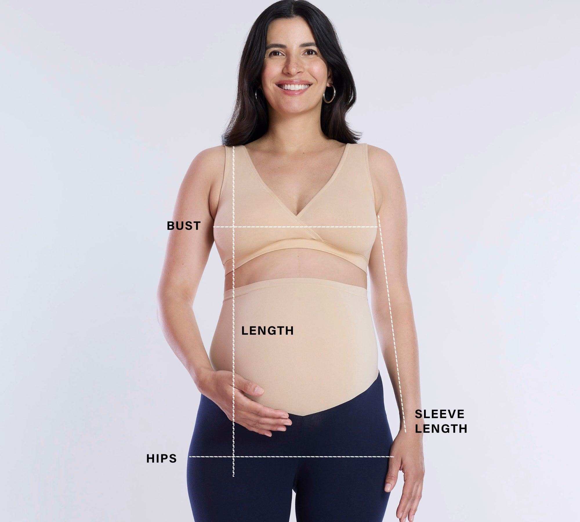 All measurements are taken with a 6-month belly to ensure an accurate fit for your maternity needs.