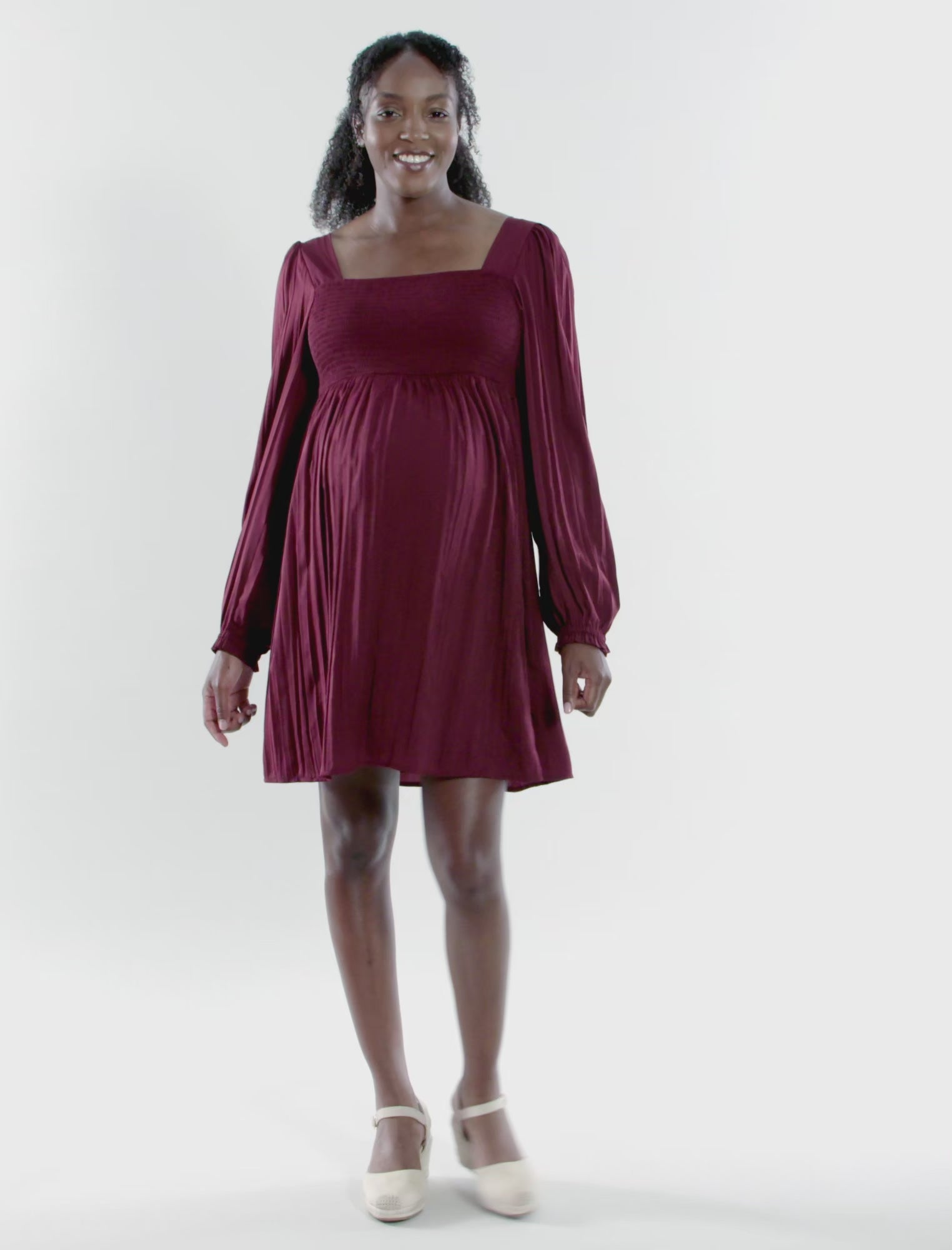ZinfandelGet ready to rock your bump in style with our Long Sleeve Babydoll Smocked Dress! Featuring a luxurious satin finish, it boasts a smocked bodice and a flowy skirt that blend comfort with flair. Perfect for any occasion, from casual brunches to elegant baby showers, this dress ensures you stay chic and comfortable throughout your pregnancy journey.